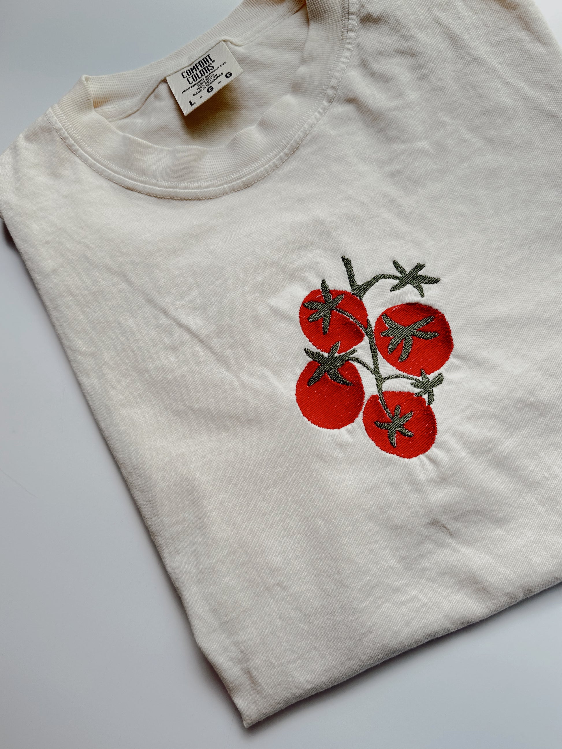 This cozy ivory tee features a playful embroidered tomato design, perfect for adding a fresh, summery vibe to your wardrobe. Made from soft Comfort Colors fabric, it’s as comfy as it is cute—ideal for sunny days and casual fun.