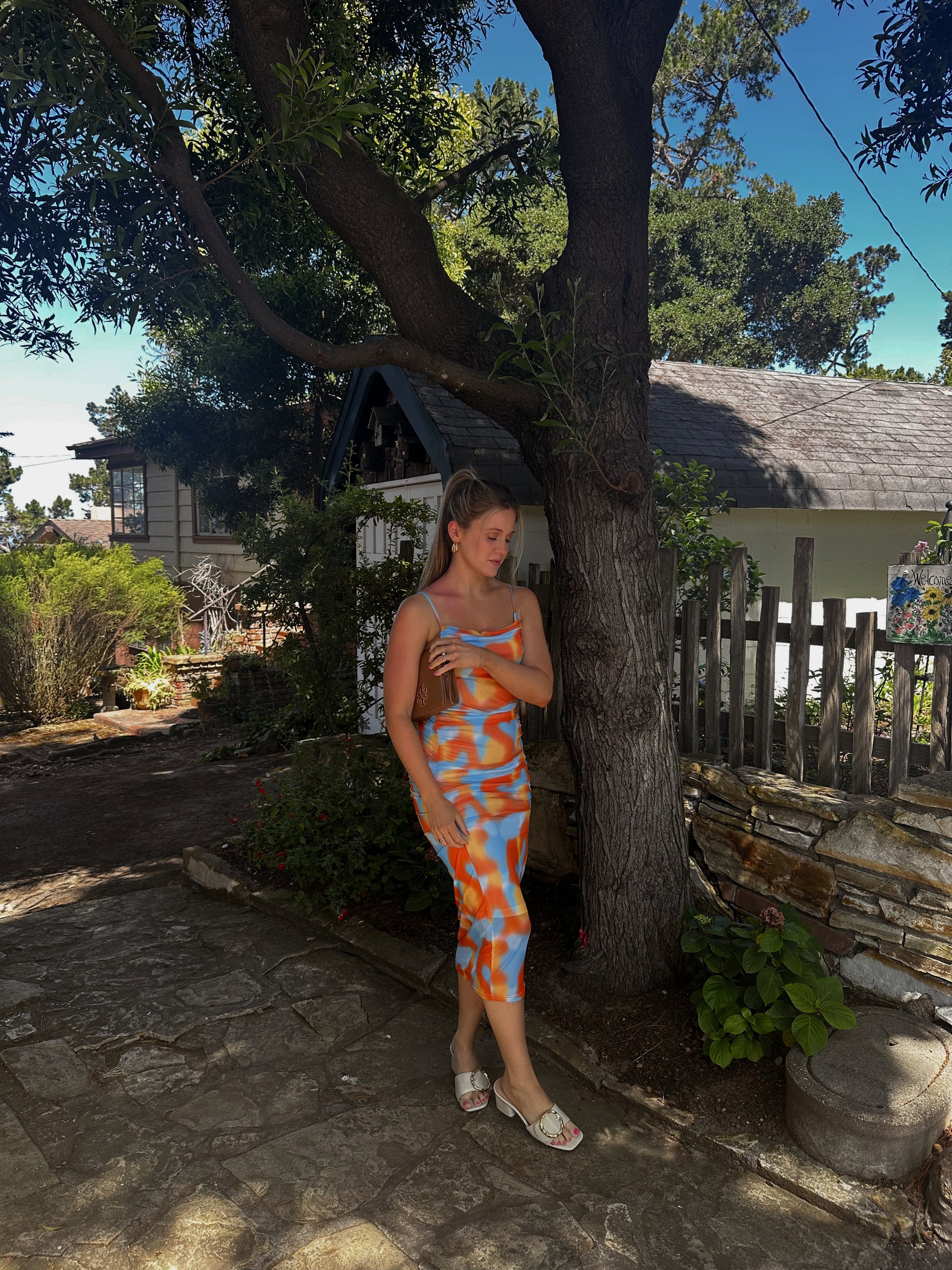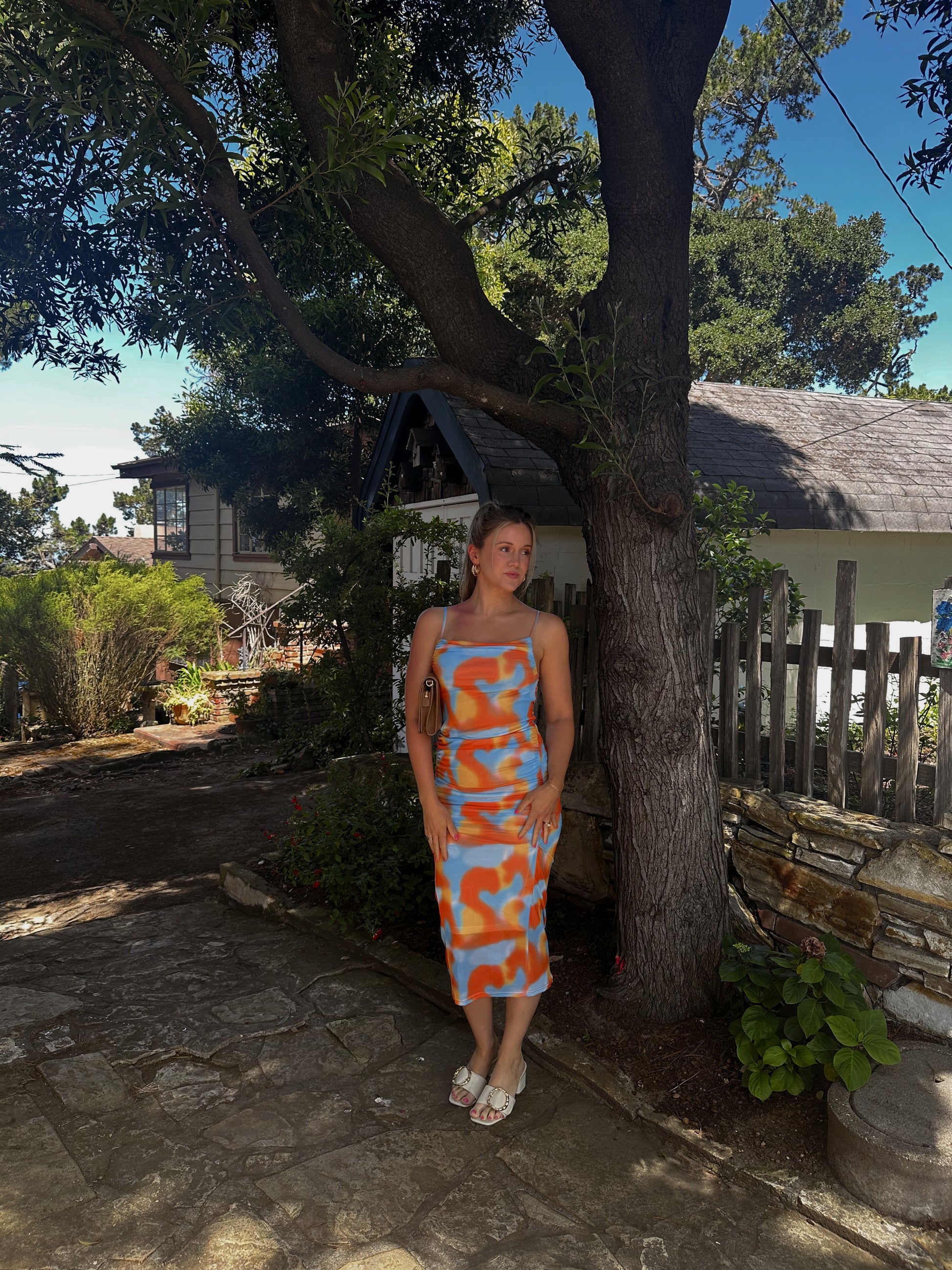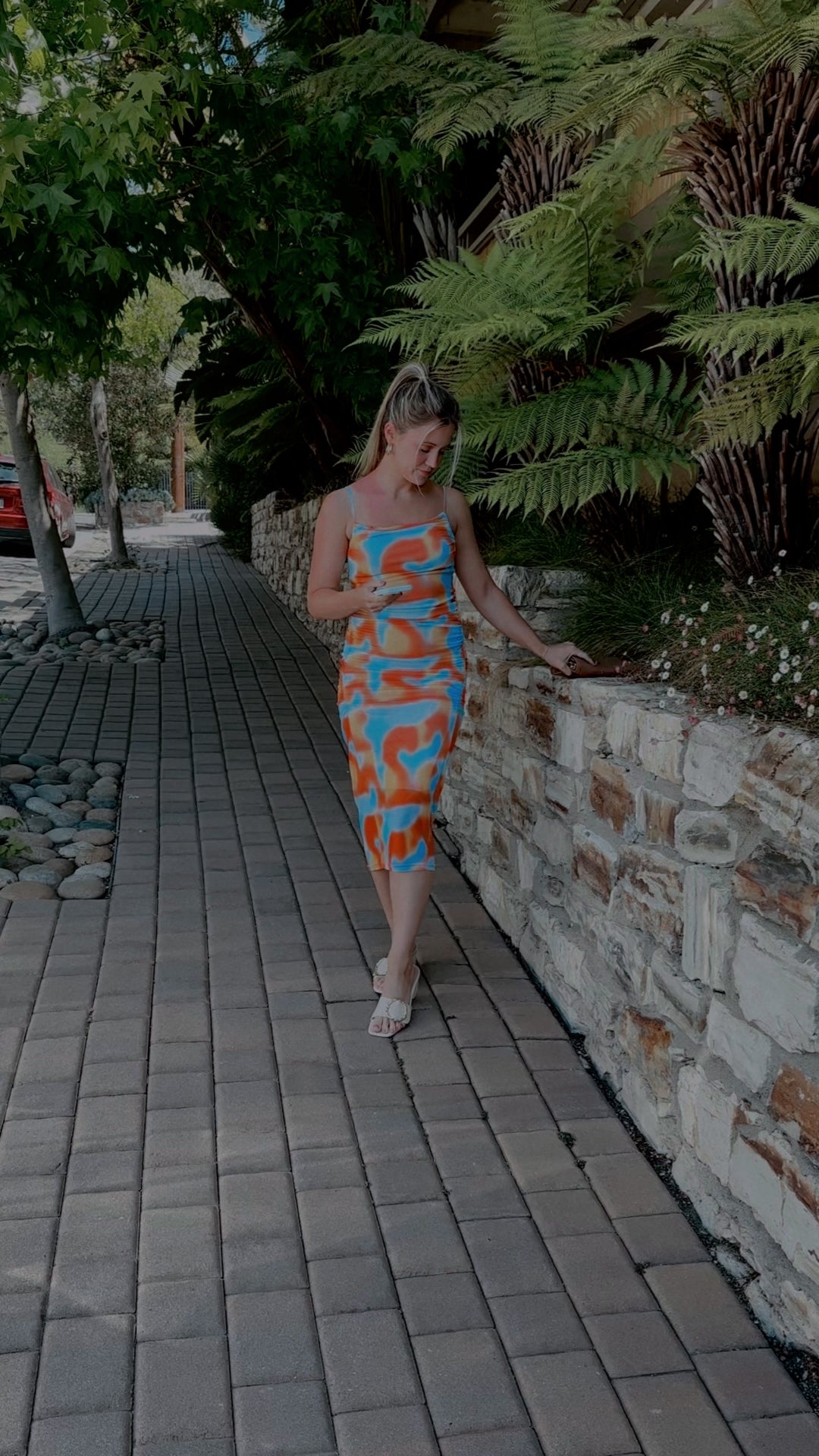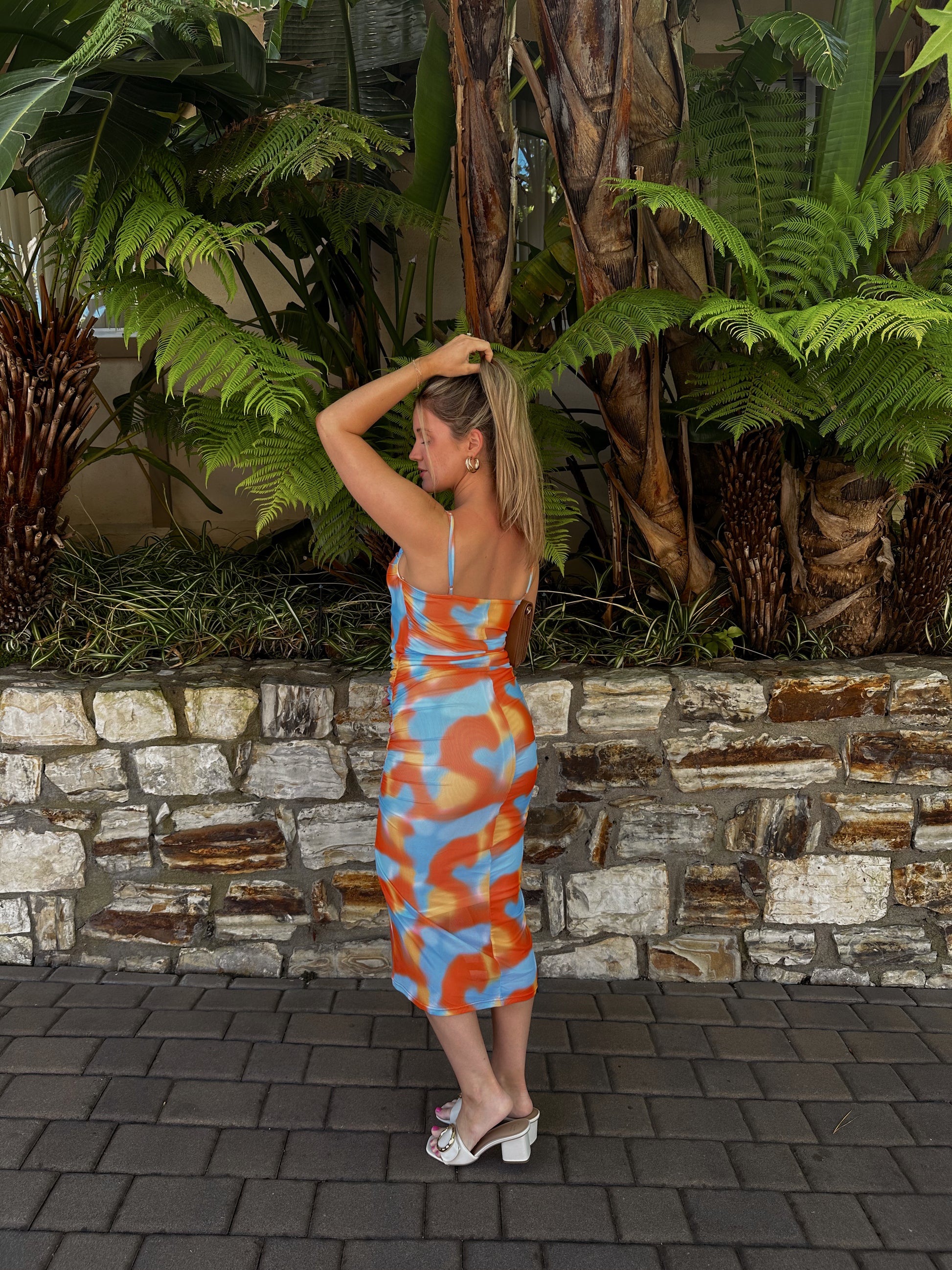 Say hello to the Heatwave Dress, the statement dress of summer! Featuring a stunning aqua and tangerine abstract design, this dress is sure to turn heads. The mesh exterior provides a comfortable and breathable fit, while the ruching along the hips adds a flattering touch. Elevate your wardrobe with this must-have dress.