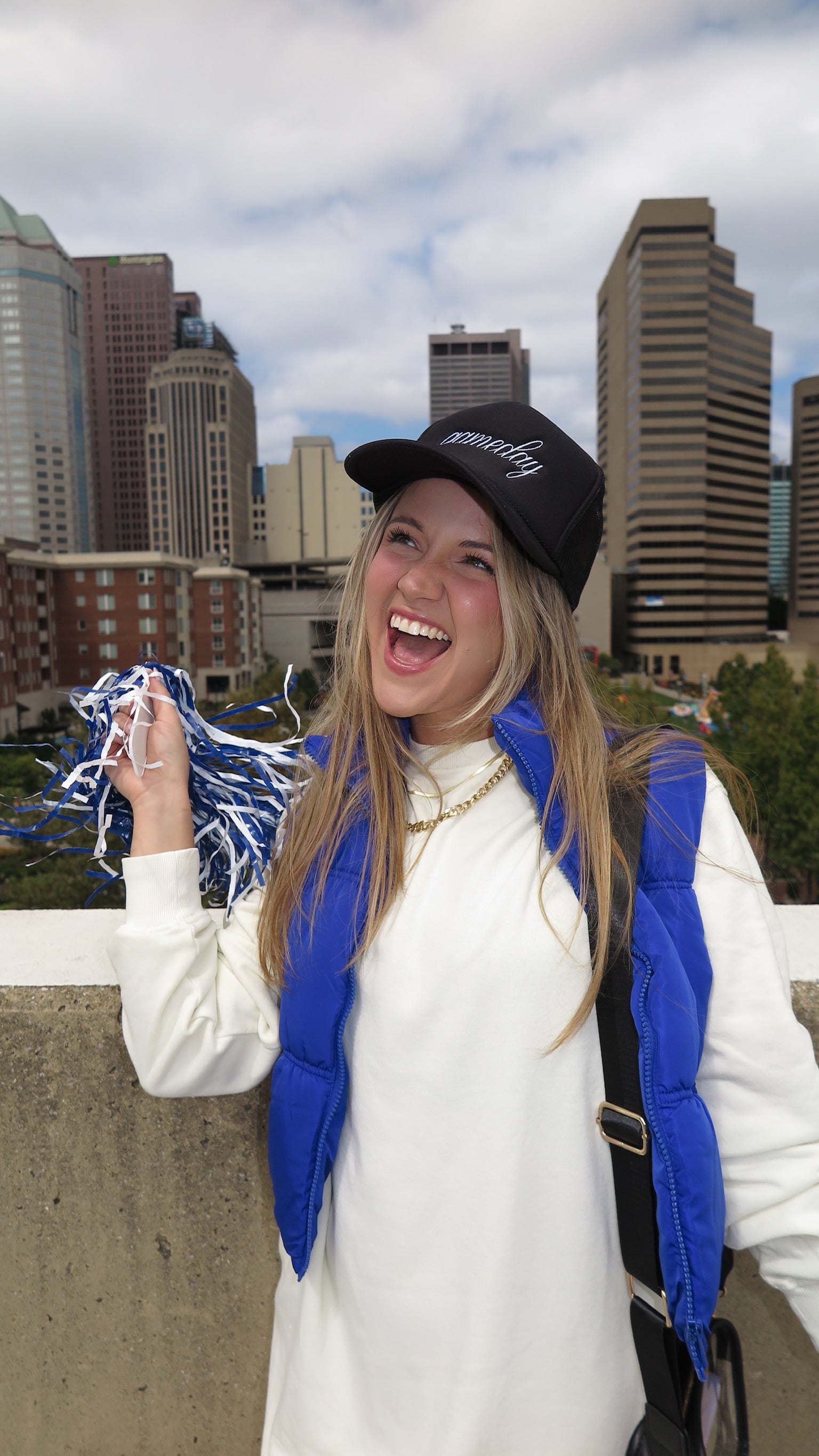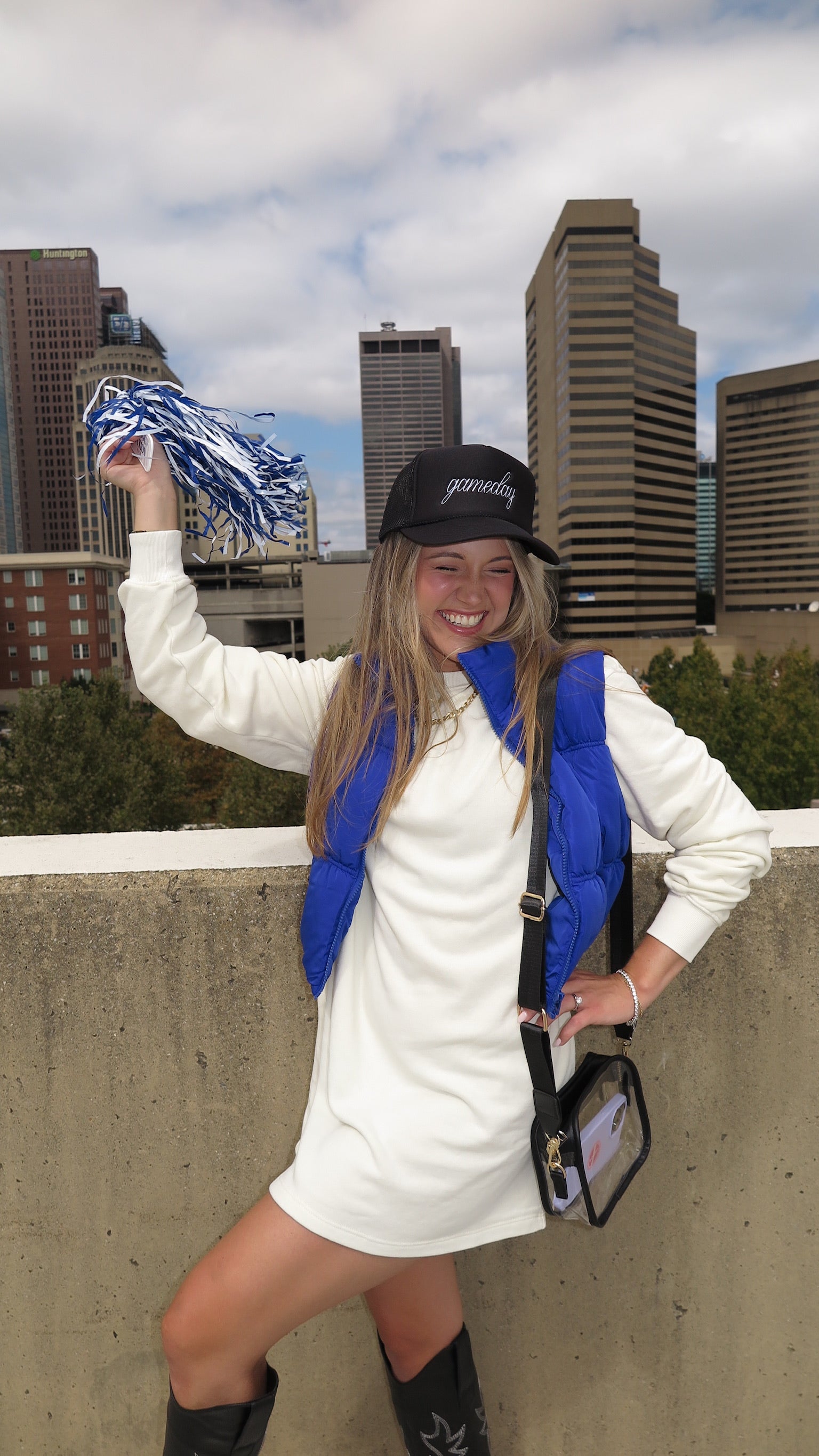 This gorgeous bag flaunts high quality finishes to complete your Game Day look! We love the seatbelt-style adjustable strap with sturdy gold hardware, and the bag itself has vegan leather trim with quality stitching. It's all in the details and this bag stands out!