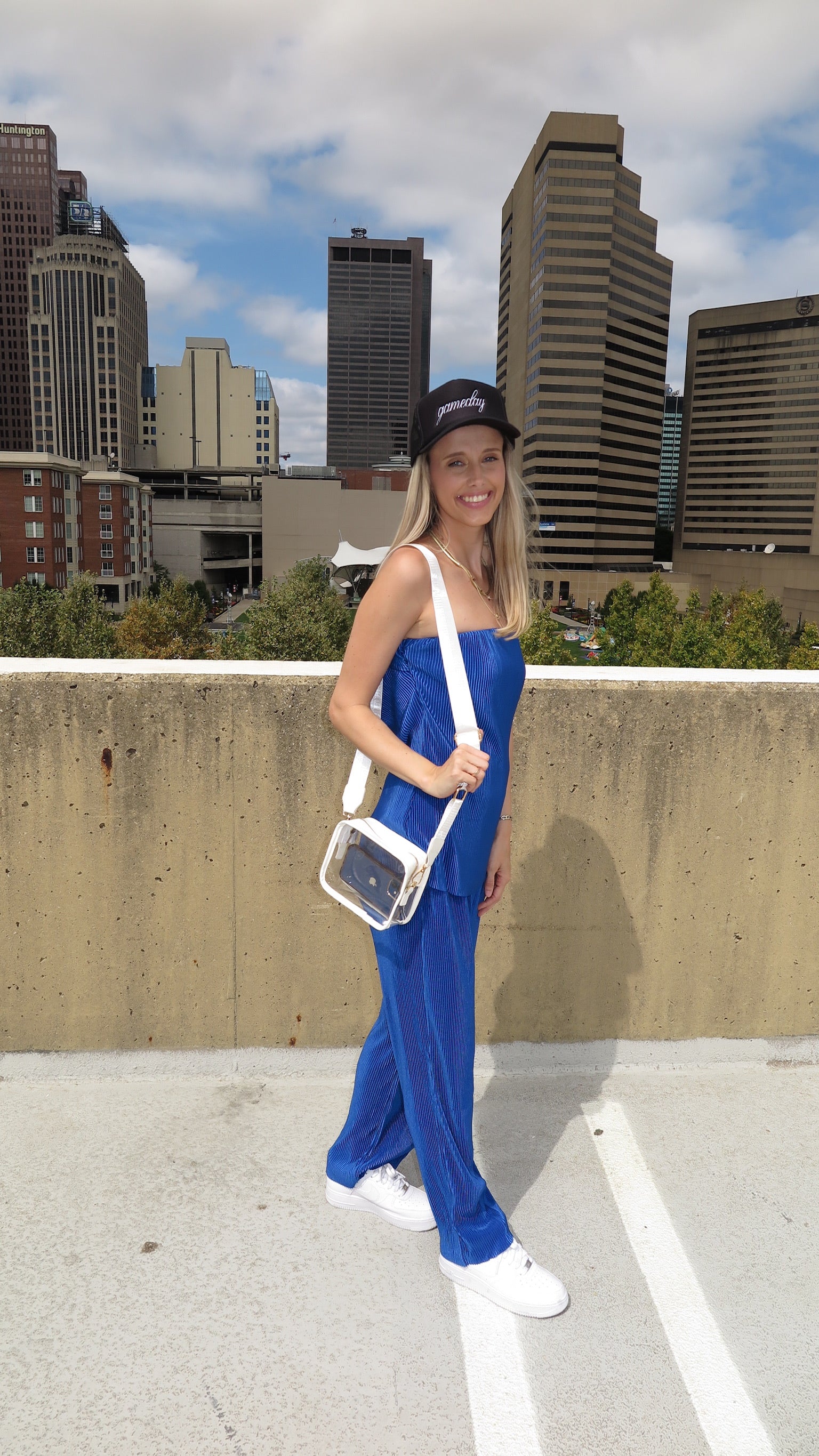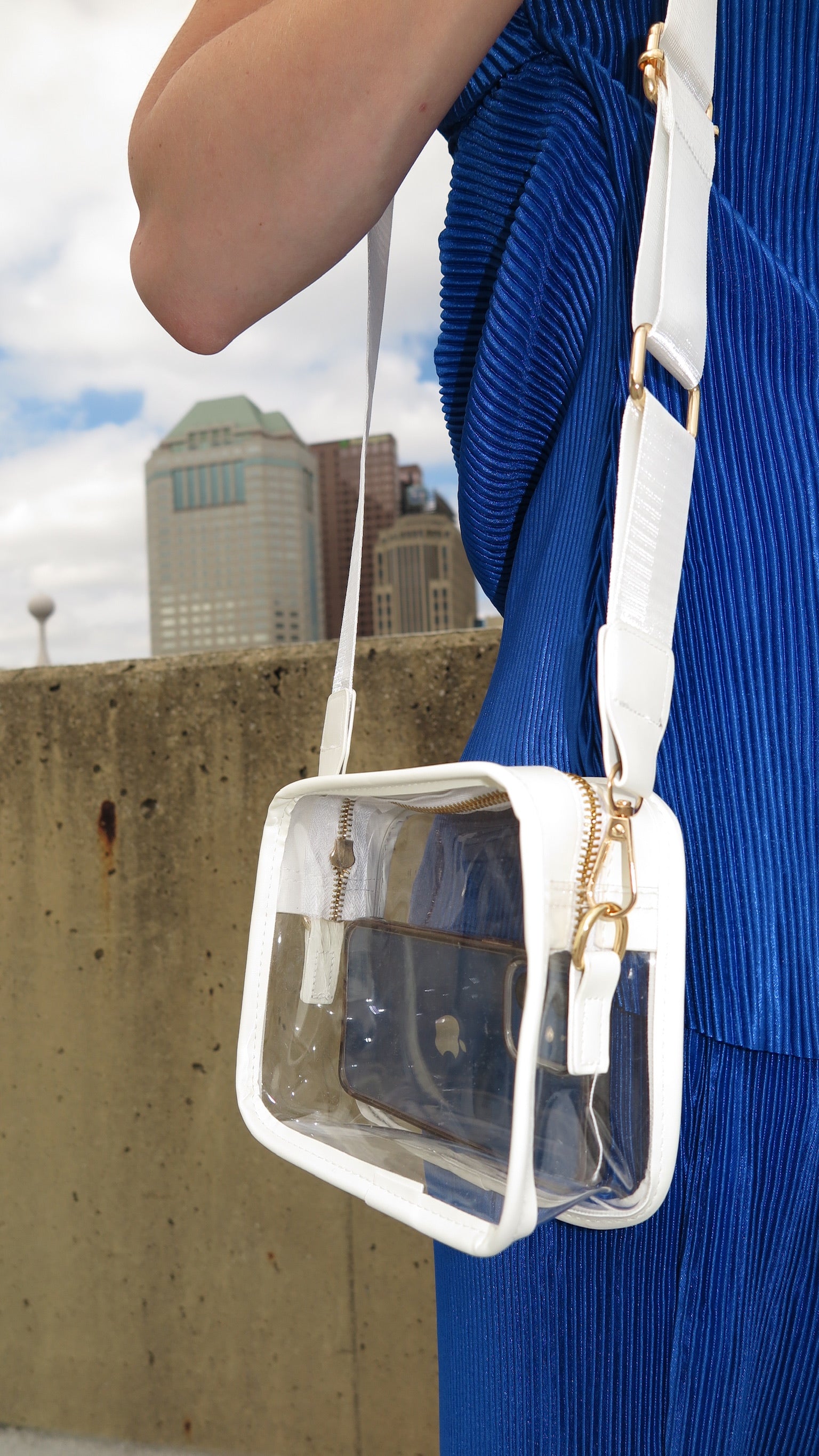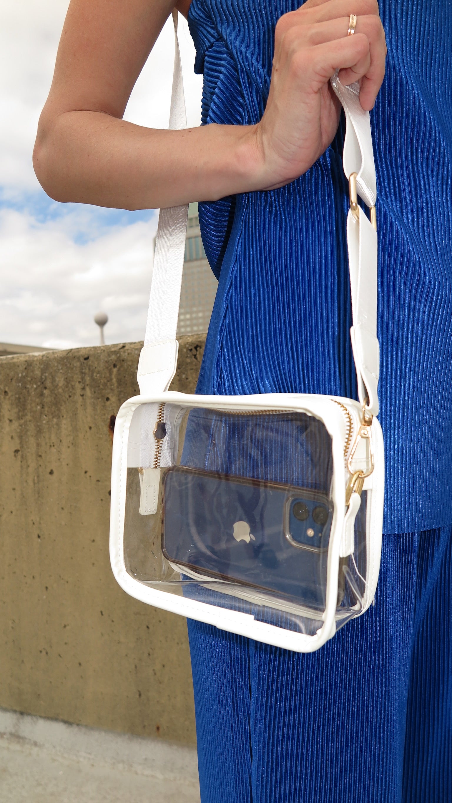 This gorgeous bag flaunts high quality finishes to complete your Game Day look! We love the seatbelt-style adjustable strap with sturdy gold hardware, and the bag itself has vegan leather trim with quality stitching. It's all in the details and this bag stands out!