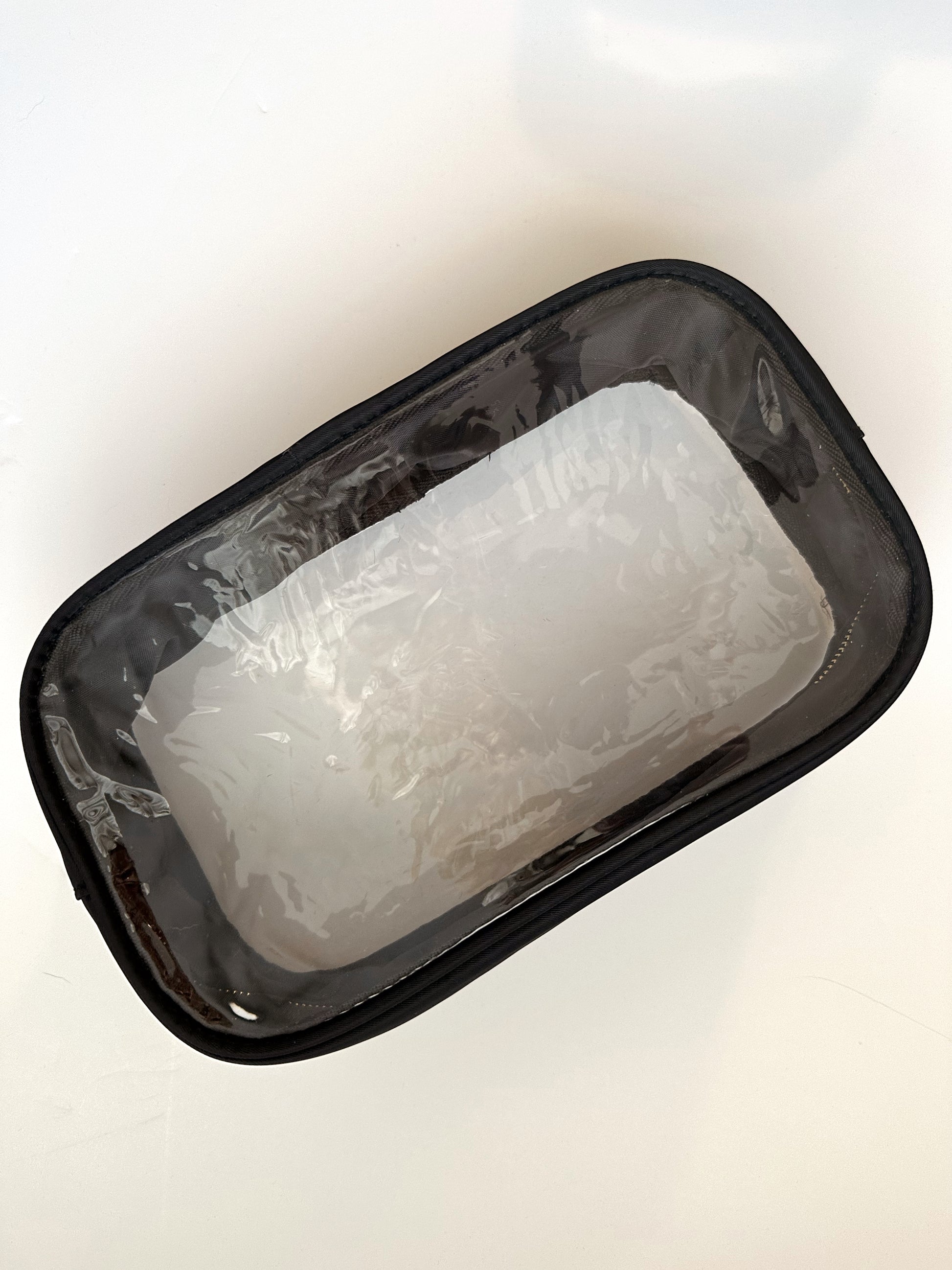 The pouch that packs a punch! This gorgeous black nylon pouch offers a compact design that's perfect for easy storage and organization. Designed with double-sided clear PVC, you'll always know what you packed on the go. This pouch features a secure zip closure with beautiful gold hardware, designed to keep all your cosmetics safe and organized while standing out in your tote or on your beauty cart at home.