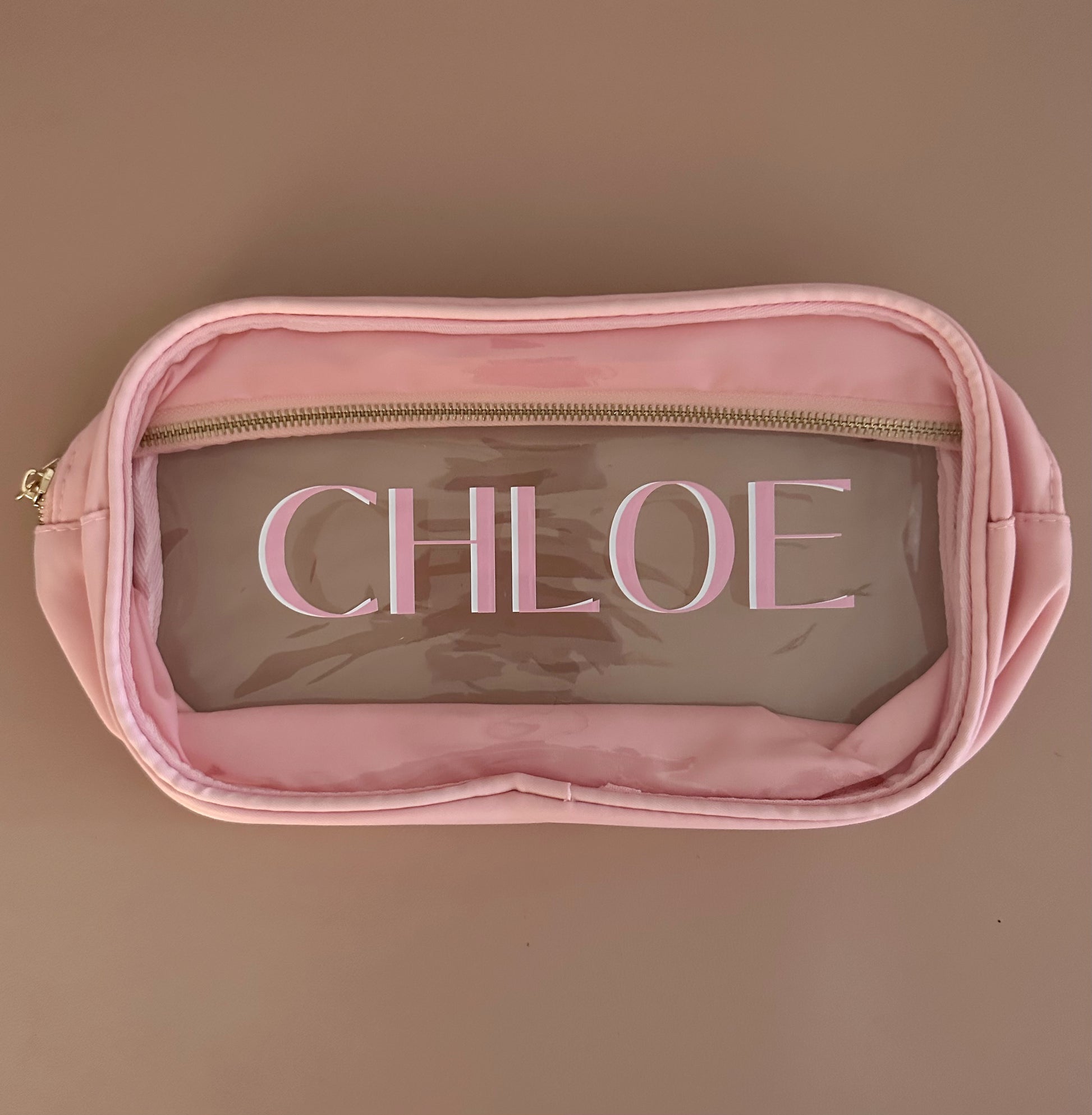 The pouch that packs a punch! This beautiful light pink nylon pouch offers a compact design that's perfect for easy storage and organization. Designed with double-sided clear PVC, you'll always know what you packed on the go. This pouch features a secure zip closure with beautiful gold hardware, designed to keep all your cosmetics safe and organized while standing out in your tote or on your beauty cart at home.