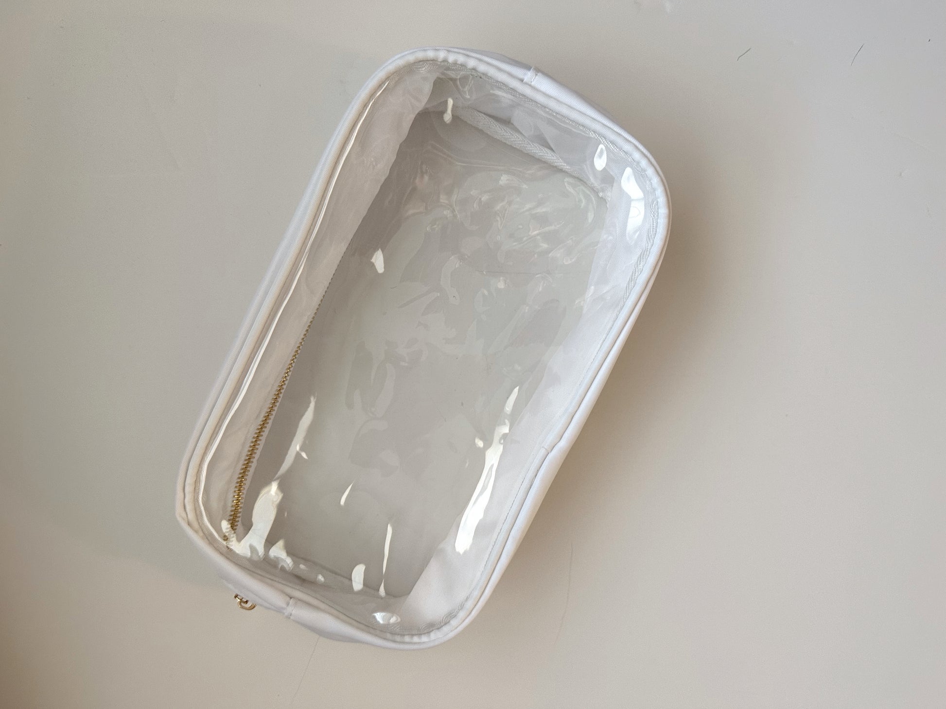 The pouch that packs a punch! This gorgeous white nylon pouch offers a compact design that's perfect for easy storage and organization. Designed with double-sided clear PVC, you'll always know what you packed on the go. This pouch features a secure zip closure with beautiful gold hardware, designed to keep all your cosmetics safe and organized while standing out in your tote or on your beauty cart at home.