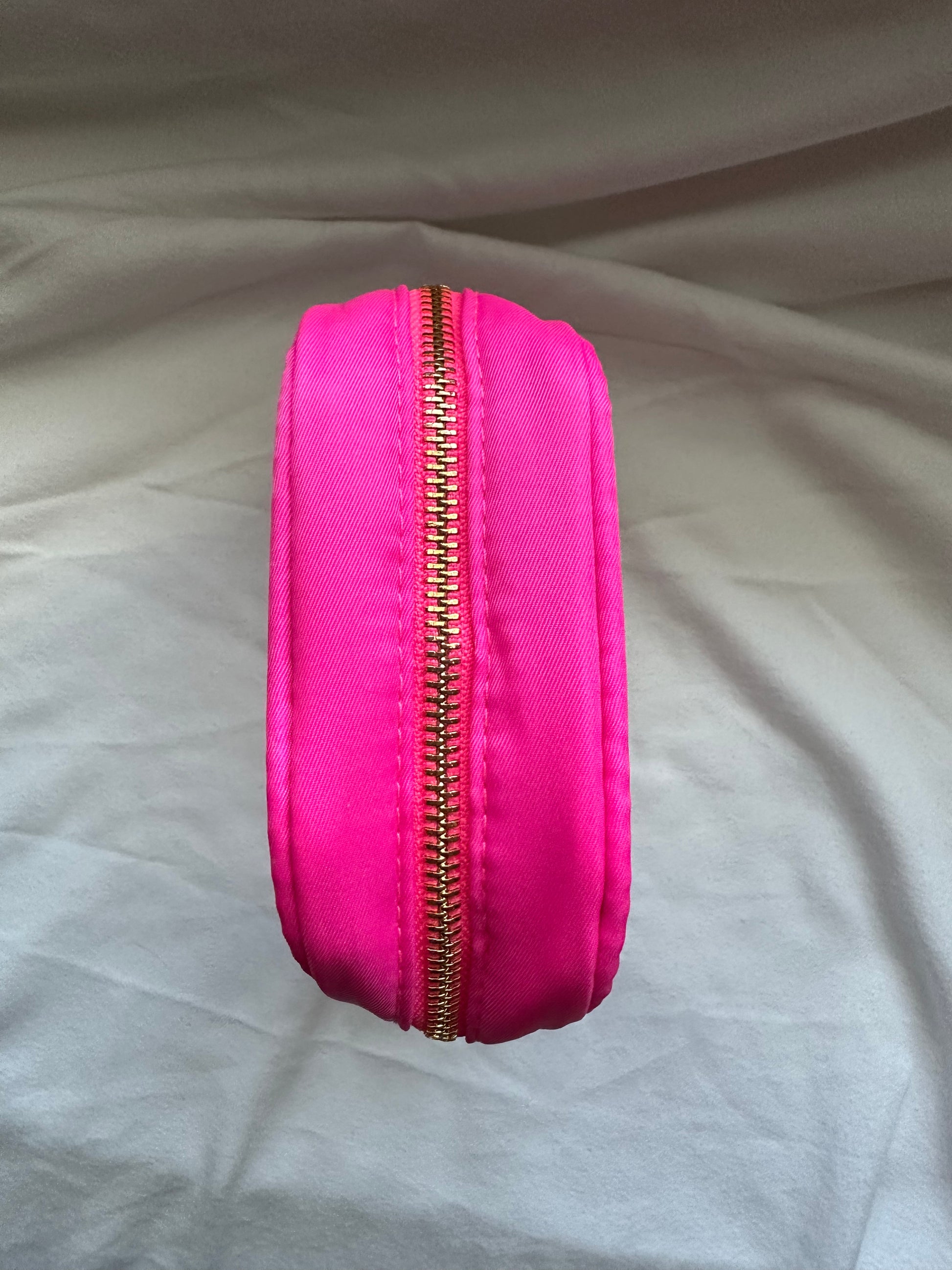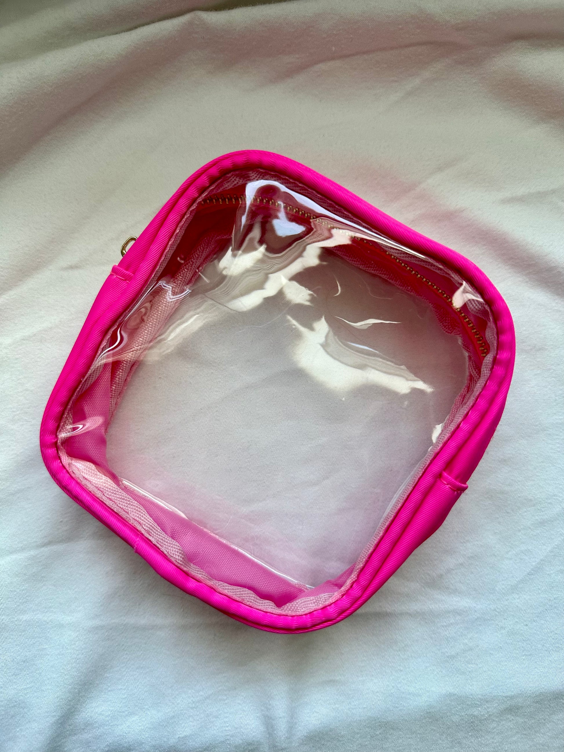 The pouch that packs a punch! This bright pink nylon pouch offers a compact design that's perfect for easy storage and organization. Designed with double-sided clear PVC, you'll always know what you packed on the go. This pouch features a secure zip closure with beautiful gold hardware, designed to keep all your cosmetics safe and organized while standing out in your tote or on your beauty cart at home.