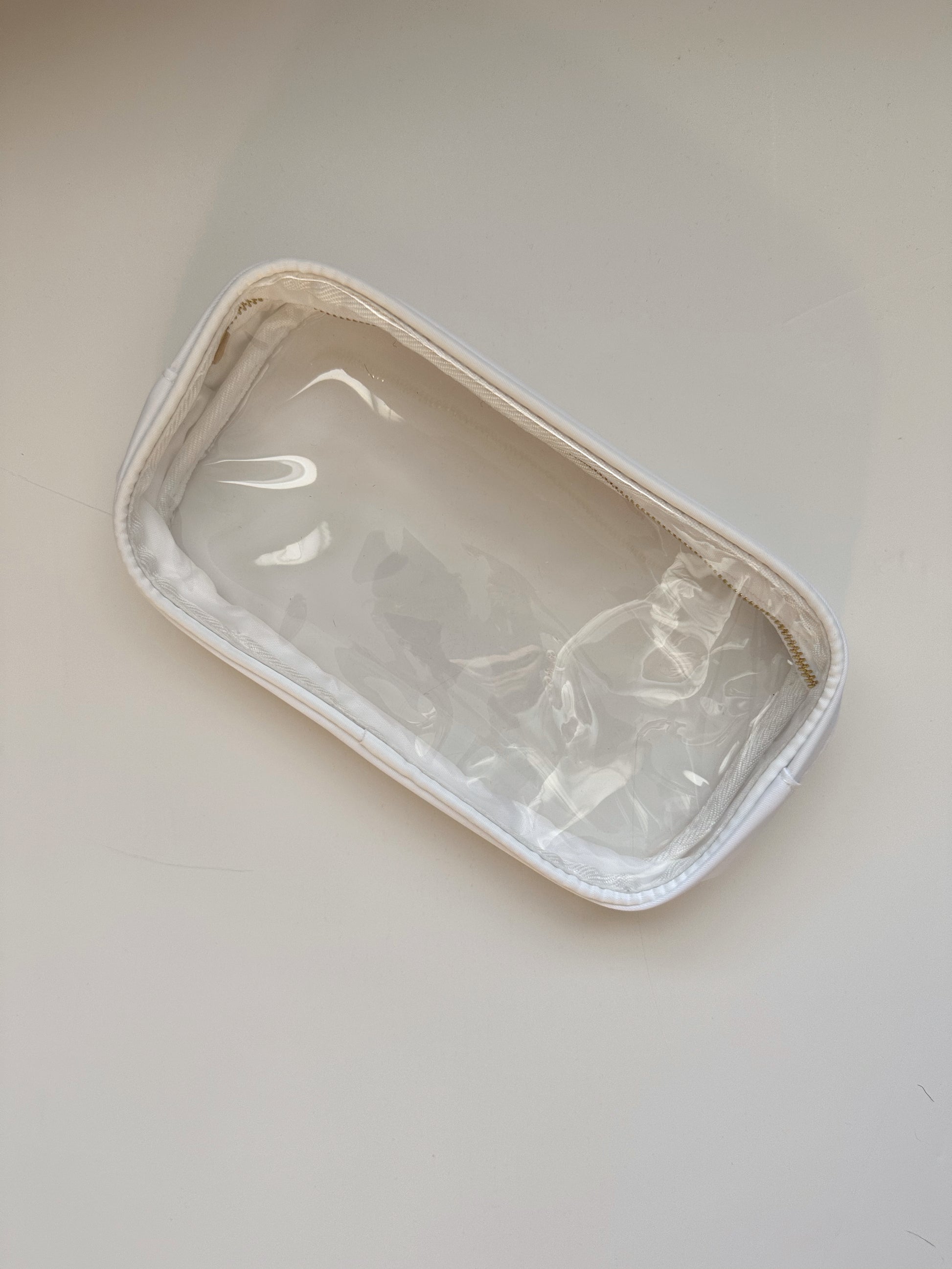 The pouch that packs a punch! This gorgeous white nylon pouch offers a compact design that's perfect for easy storage and organization. Designed with double-sided clear PVC, you'll always know what you packed on the go. This pouch features a secure zip closure with beautiful gold hardware, designed to keep all your cosmetics safe and organized while standing out in your tote or on your beauty cart at home.