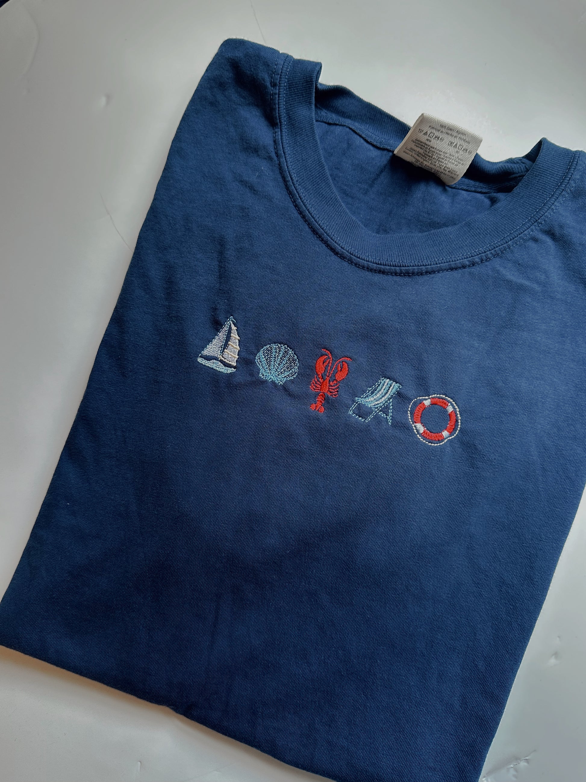 Set sail in style with this navy Comfort Colors tee, embroidered with trendy nautical designs. Soft and playful, it’s perfect for adding a fresh, seaside vibe to your everyday look.
