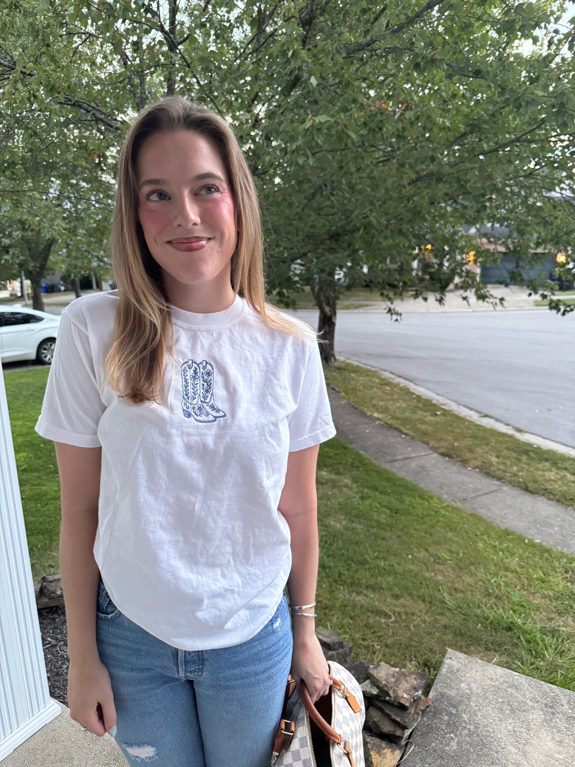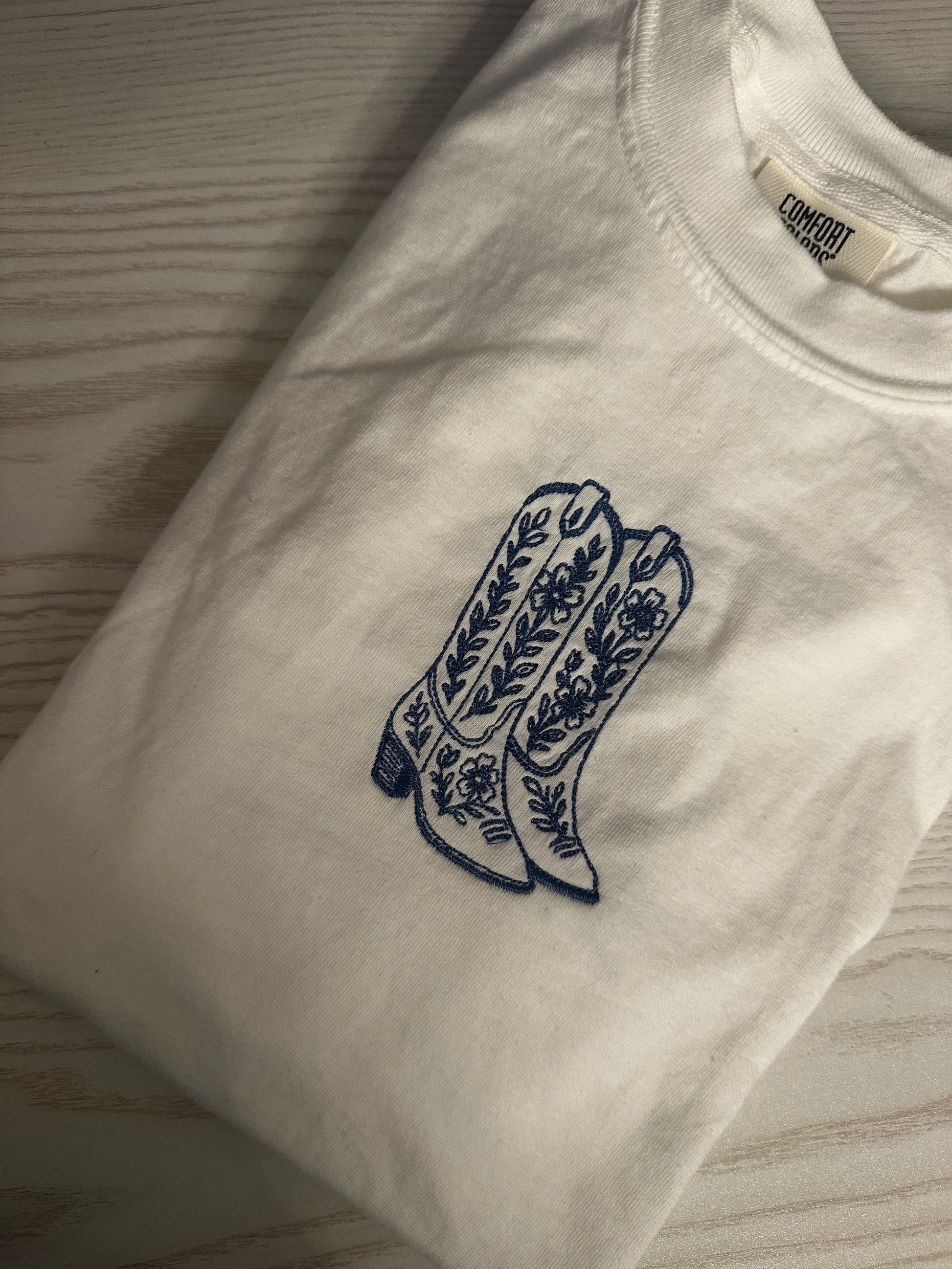 This royal blue Comfort Colors tee showcases trendy embroidered white cowgirl boots, combining playful charm with all-day comfort. It’s the perfect pick for adding a stylish western twist to your casual wardrobe.